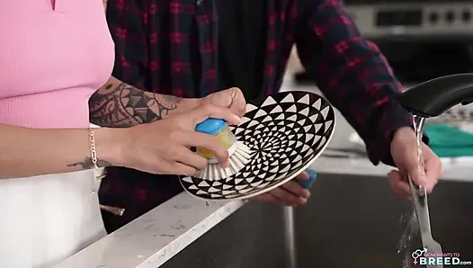 Brunette babe Samantha Pink riding a cock in a kitchen